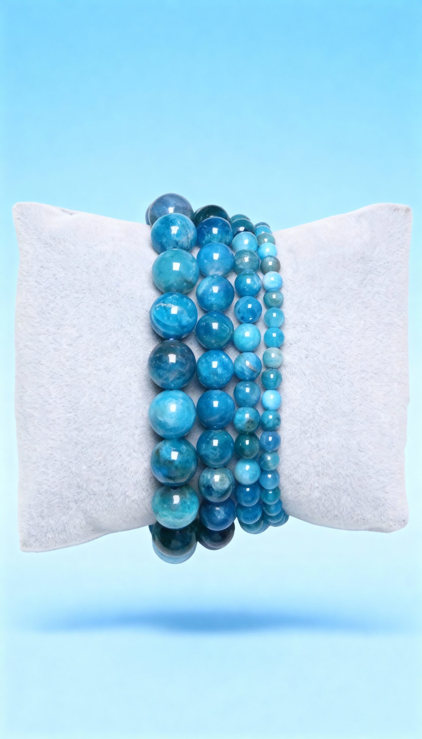 Hechas a mano con dedicación, nuestras pulseras de apatita azul capturan la belleza pura de la naturaleza y la sabiduría de las tradiciones antiguas. Cada cuenta es única, cuidadosamente seleccionada por su vibrante tonalidad y sus reflejos profundos y luminosos.